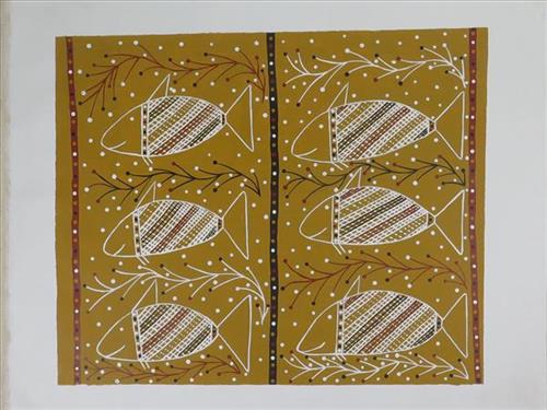 All artworks are made by local artists living in the community. Artwork reflects the traditional songs and stories that have been passed down through the generations with a contemporary edge.  Fibre art is a special feature of Djilpin Arts as is its Gapu Series of fine art prints.