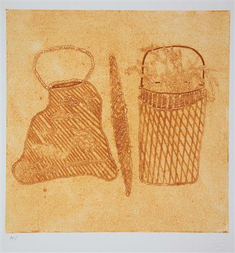 The 2025 Gapu series is the 12th workshop series in Djilpin’s long collaboration with Basil Hall Editions. Djilpin Artists worked, for the first time, with Printmaker Antonia Aitken. Collograph plates were developed by 15 artists over a week in April at Djilpin Arts Centre in Wugularr (Beswick). For Series XII, artists have depicted traditional string and dilly bags, bathi, exploring the place of these artefacts in culture, ceremony and mythology.
