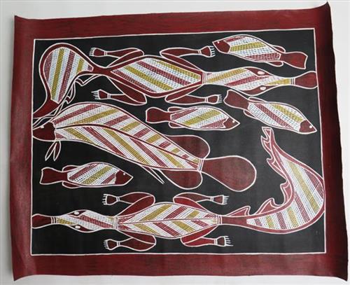 This painting depicts two long nosed crocodiles swimming in the billabong with young barramundi and their mother barramundi. The rarrk represents the Yirritja moiety. This is my songline. Paintings created by Djilpin artists showcase the traditional ‘rarrk’, cross-hatching pattern from Arnhem Land. This style is highly distinctive and often uses colors such as red and yellow oxide, titanium white and carbon black. The figurative depictions and patterns are deeply symbolic, representing stories and skin groups as well as cultural and spiritual beliefs passed down from ancestors. The use of brushes like the Jarlk brush, crafted from local billabong reeds, adds an extra layer of authenticity to the work, connecting the artists with the land and their heritage.