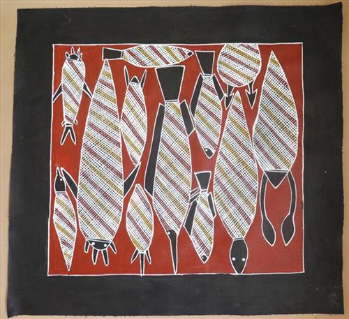 This painting depicts creatures found in the billabong including catfish, bream, swordfish. Also depicted are waterlillies.