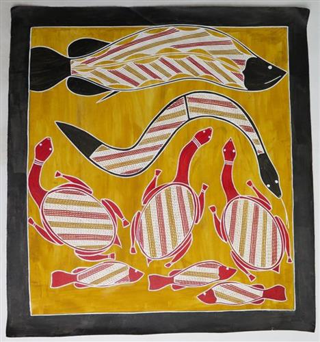 This painting depicts food found at the billabong, including long neck turtle, freshwater snake and young barramundi with mother barramundi. The rarrk represents Yirritja moiety.