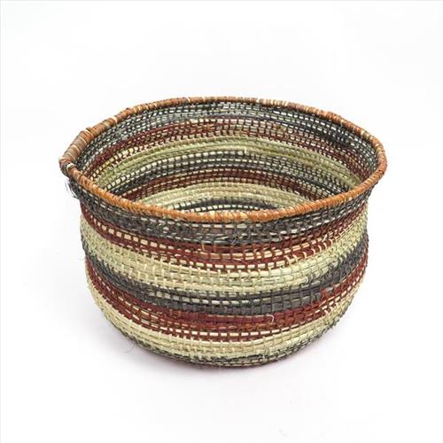 Pandanus fibre art is labour intensive requiring a high level of care and fine needlework. Finished works are both functional and beautiful. Women collect pandanus by pulling from the top of a pandanus tree, stripping then dying the leaves using natural bush colour.