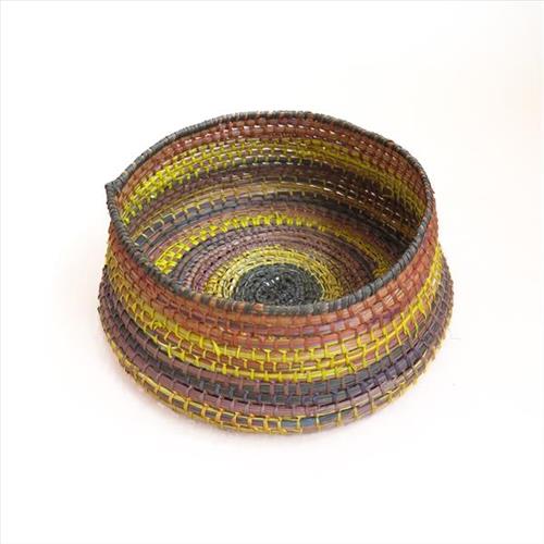Pandanus fibre art is labour intensive requiring a high level of care and fine needlework. Finished works are both functional and beautiful. Women collect pandanus by pulling from the top of a pandanus tree, stripping then dying the leaves using natural bush colour.