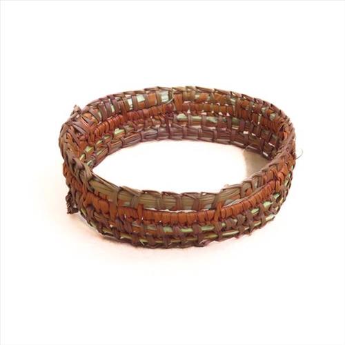 Pandanus fibre art is labour intensive requiring a high level of care and fine needlework. Finished works are both functional and beautiful. Women collect pandanus by pulling from the top of a pandanus tree, stripping then dying the leaves using natural bush colour.