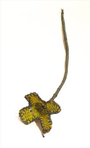 Pandanus fibre art is labour intensive requiring a high level of care and fine needlework. Finished works are both functional and beautiful. Women collect pandanus by pulling from the top of a pandanus tree, stripping then dying the leaves using natural bush colour.