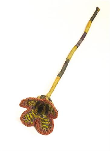 Pandanus fibre art is labour intensive requiring a high level of care and fine needlework. Finished works are both functional and beautiful. Women collect pandanus by pulling from the top of a pandanus tree, stripping then dying the leaves using natural bush colour.