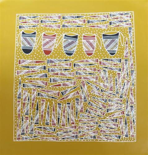 This painting represents five dimbuka dilly bags surrounded by many stone spears. It is a Wägilak story.