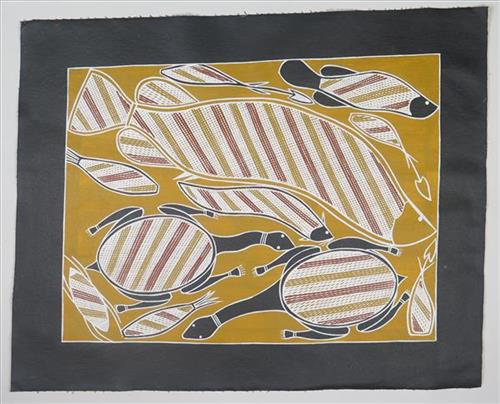 This painting depicts two longneck turtles, one barramundi, one jarlumbu (catfish), one burgon (live bait fish), water lillies, water yams and one water insect running on top of the water.