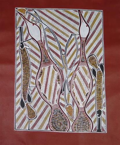 This painting depicts two diving ducks, two long tom and waterlillies – all freshwater bush tucks foods.
