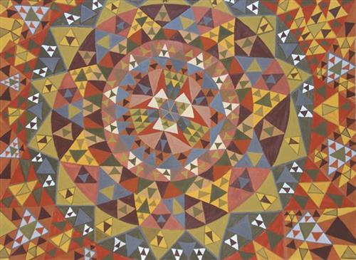 Goorloordoordoog – the peace pigeon created this country by scratching out the ground with his feet in the Dreamtime. The central design represents a freshwater spring that the pigeon hid underground. A long time ago this place may have been a desert. The old people had to dig for water and used to walk across the country with water in their mouths swallowing a little bit at a time to save their thirst before finding the next place to dig for water. This spring is a dreaming place and should be protected but it has been destroyed by pastoralists who have allowed cattle to roam all over it. I use the nuclear waste symbol at the centre as a sign to say – keep away!