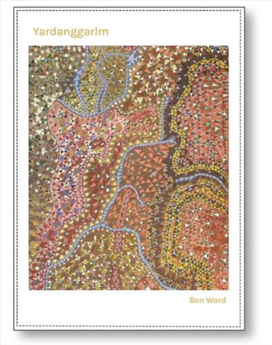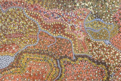 Ward depicts a traditional area of Miriwoong Country outside Kununura in the east Kimberley, WA. “This painting is also about ceremony for young men.” Ward maps out Country, its ranges, river systems, rocky outcrops, natural springs and even Lake Argyle through the use of vividly coloured tessellating ochre triangles. The amorphous shape in the centre of the painting, represents Yardanggarlm or Dingo Springs, a large outcrop created by the Dingo when he passed during the Dreamtime for male ceremony on his