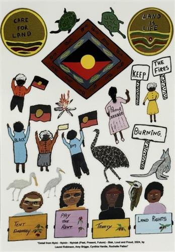 From bucket hats and enamel camping mugs to fun sticker sheets, each product in this collection spotlights an element from Nyini – Nyinin – Nyiniak (Past, Present, Future) – Blak, Loud and Proud (2024) by our Elders Laurel Robinson, Amy Briggs, Cynthia Hardie, and Rochelle Patten.