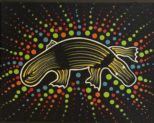 Brett Wilson, a Yorta Yorta man from Echuca, started painting around the age of 8 (self-taught). A few years down the track his passion led him to Bendigo Regional Institute of TAFE, Echuca Campus where he studied Certificate I, II and III in Aboriginal and Torres Strait Islander Cultural Arts. The course gave Brett the opportunity to try different mediums.
