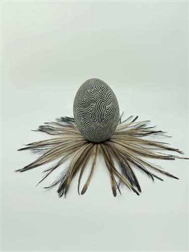 These hand painted Emu eggs sit cradled in a bed of Emu feathers, symbolising the deep and unbreakable connection between land, life and spirit. The intricate patterns painted onto the Emu eggs reflects the winding paths of country, rivers, songlines and the stories carried through generations. These pieces are a tribute to the strength of our Ancestors, the beauty of our lands and the stories that live on through us.