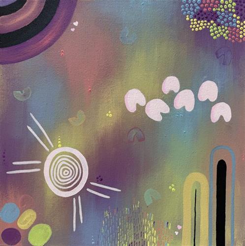 This Artwork is a bright, happy, colourful contempory Indigenous painting that illustrates my personal experences and emotions. I have named this work ‘Rose Coloured Glasses’ as it shows how beautiful experences, relationships, and your surroundings can seem when you are in ‘Rose Coloured Glasses’ and always see life in a positive way. However, sometimes this mindset can obscure your “Vison” and make you “Blind” to the problems in your own life. I personally aim to always have a positive mindset but never let that blind me or hold me back.