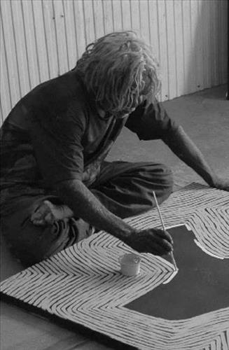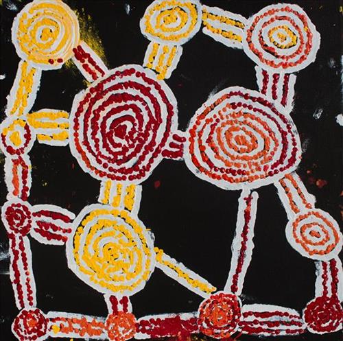 George Ward Tjungurrayi was born in the desert west of Kiwirrkura in 1947. George’s painting depicts a story about Tingari men travelling through his ancestral country from rockhole to rockhole meeting other Tingari men for business Lake MacDonald way. The men turned into Warnambi.