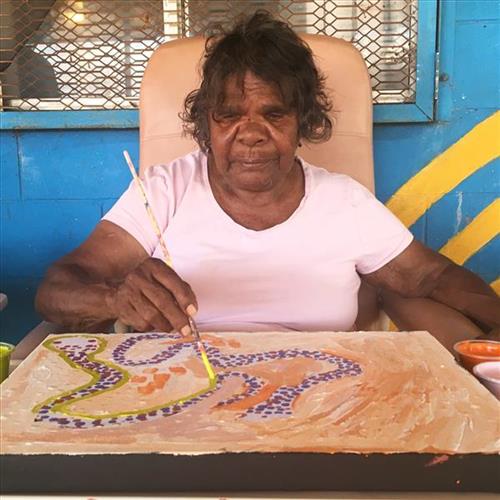 Elaine is a senior artist from Papulankutja Community who paints with Warakurna Artists through the Painting Therapy Program run once weekly out of Wanarn Aged Care.