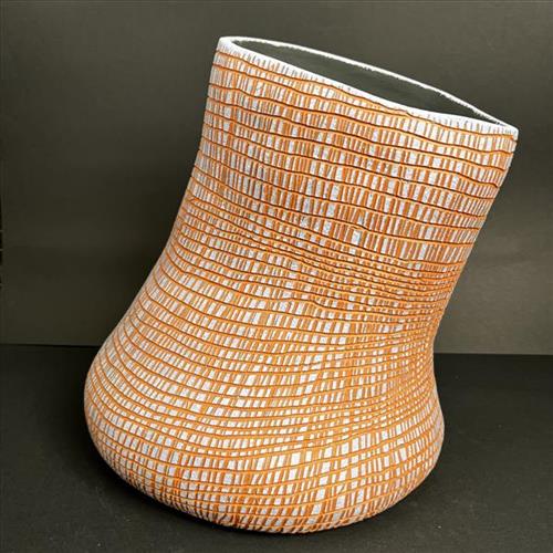 This design shows how the bottom part of a black palm basket is woven. My grandmothers and aunties used to make them. They cut off the young palm leaves in the centre, stripped and scrapped them. Then they would put the strips in freshwater to make them soft and keep them straight for weaving.