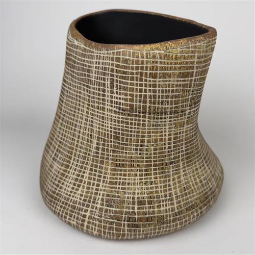 This design shows how the bottom part of a black palm basket is woven. My grandmothers and aunties used to make them. They cut off the young palm leaves in the centre, stripped and scrapped them. Then they would put the strips in freshwater to make them soft and keep them straight for weaving.