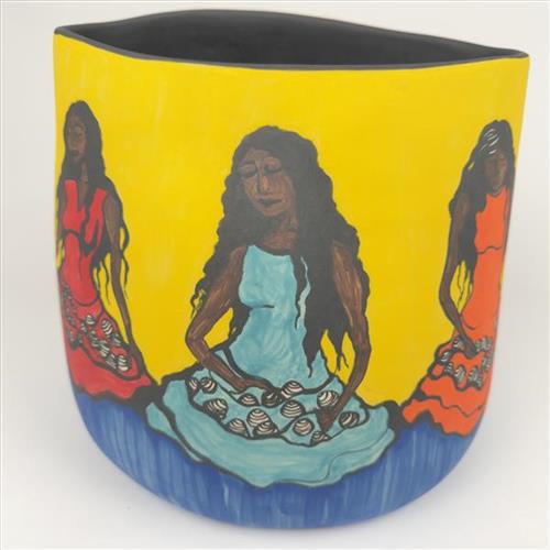 Mukirr dance is about when I would go with my mum, aunties and other family to the Daintree River to harvest freshwater mussels. Using our feet on the river bed, we would feel where the mussels were. Once we located them we would dive to collect them. We used our dresses as holding vessels. Once our dresses were full, we would swim to the bank and off-load to another family member who would get them ready to eat by putting them on the fire. When the ladies were feeling with their feet, it would look like they were dancing in the water. Mukirr means mussels, that is why this artwork is called ‘Mukirr Dance’. The Mukirr dance to me represents my mother, aunties and older cousins as well as many other Yalanji women of the past because this was an important part of people’s life. Today, some ladies still collect mussels up in the shallow area of the Daintree River.