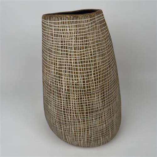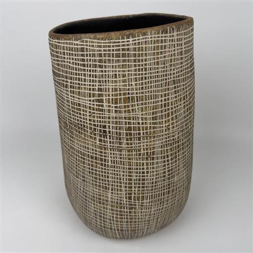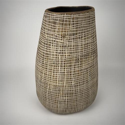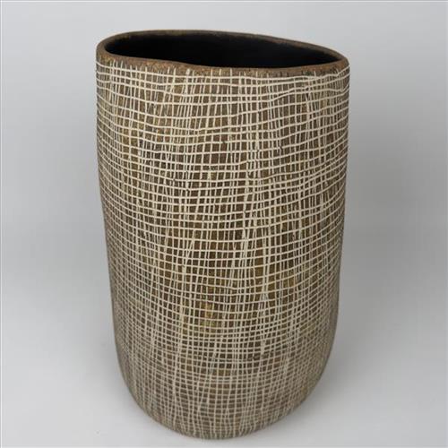 This design shows how the bottom part of a black palm basket is woven. My grandmothers and aunties used to make them. They cut off the young palm leaves in the centre, stripped and scrapped them. Then they would put the strips in freshwater to make them soft and keep them straight for weaving.