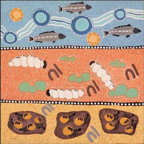This painting is about when the salmon running, when the cold weather comes and we go the our fishing spot too catch them. I Love my country the spinifex and the red and orange sand. Digging for the honey ants in the desert.
