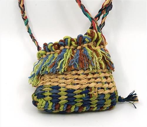 The bag is made of natural raffia and tie-dyed cotton twine.