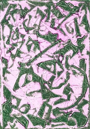 The artwork is a collagraph, printed on Hahnamule paper (100% cotton rag with strong archival properties). The textures in the work are drawn from a range of natural fibres, plants and other surfaces.