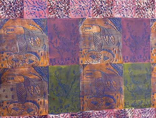 The Lino tile is carved by the artist at Bábbarra Designs. It is printed on fabric by hand using a variety of colours and layers. The linocut technique ensures each textile is a one-off, limited edition piece.