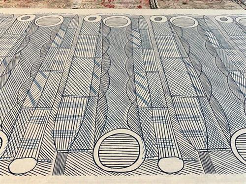 In this design, Jennifer has depicted kun-madj (dillybag), which is a large woven collecting basket. These large bags are often made from the burney vine (Malaisia scandens), a strong, pliable plant that grows along the ground and into the canopy of monsoon vine thickets. The bags are used to collect heavy foods, such as fish caught in conical fish traps or yams. They can also be made from kun-dayarr (Pandanus spiralis), a palm that grows in many areas of Arnhem Land. Tightly woven dillybags are used to collect sugarbag, the native honey.