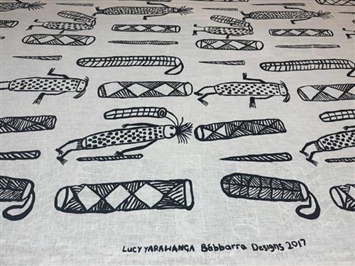 Lucy Yarawanga is a multi talented and highly respected artist represented by Bábbarra Women’s Centre and Maningrida Arts and Culture. Drawing on her deep cultural heritage, Lucy  incorporates her ancestral stories into her textile work, creating pieces that reflect the depth of her connection to country and culture.
