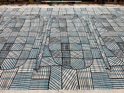 Deborah has depicted kunmadj (dillybag), which is a large woven collecting basket. These large bags are often made from the burney vine (Trophis scandens), a strong, pliable plant that grows along the ground and into the canopy of monsoon vine thickets. The bags are used to collect heavy foods, such as fish caught in conical fish traps, or yams. They can also be made from kun-dayarr (Pandanus spiralis), a palm that grows in many areas of Arnhem Land. Tightly woven dillybags are used to collect sugarbag, the native honey.