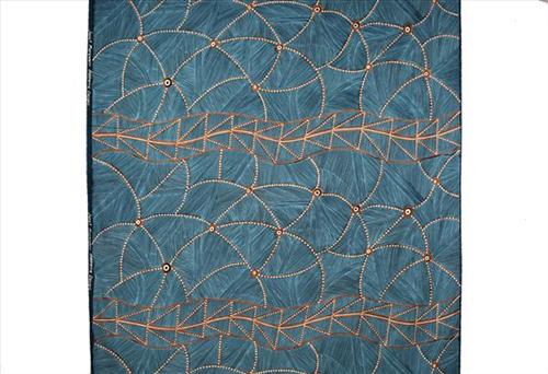 Janet Marawarr has depicted kunkurra, the spiralling wind associated with several sites in the Kardbam clan. On one level, this design can be interpreted as a depiction of the kinds of mini-cyclones common during the wet season in Arnhem Land, where the artist lives. Kunkurra also relates specifically to a site called Bilwoyinj, near Mankorlod, on the artist’s clan estate.