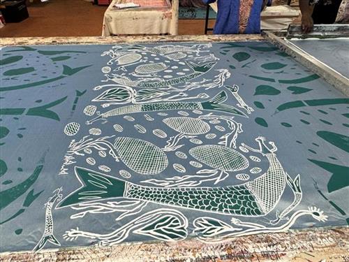 This design depicts the story of the artist’s ancestral dreaming, the Djómi (Fresh Water Spirit).