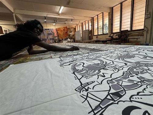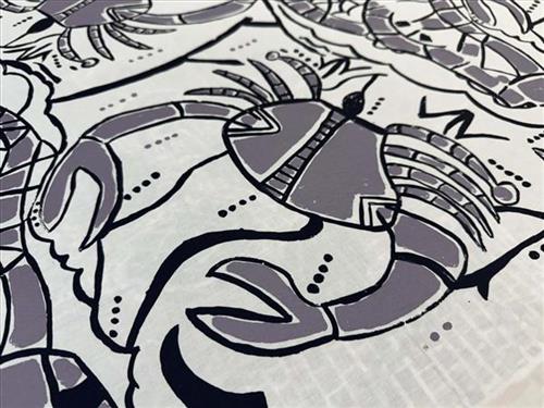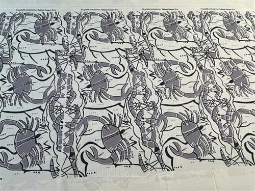 This design tells the story of Elizabeth’s homeland – a dreaming place, a good dreaming place with plenty of Barnkabarra (Mud Crabs). Elizabeth’s homeland lies east of Maningrida, at the mouth of Blyth river. This country is known for a large spiritual mud crab, which lives in the area.