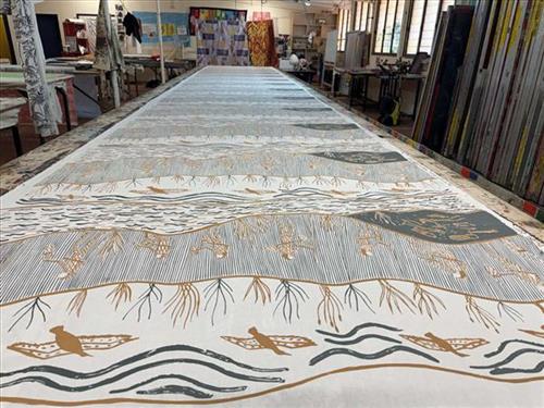 A two colour screen print design from 2022. Jay’s first large format design to join the Bábbarra Designs Collection