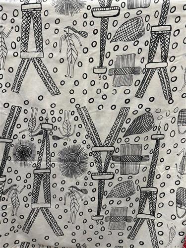 We came to Maningrida, I started to draw. I drew that tower from France, but also I drew maladj (stone country orphan spirit), women’s sacred woven mat, fish traps and rolk (insects). I also put round kunngol (clouds) in the design, those circles. That maladj spirit, it’s standing there next to the Eiffel tower, looking at the dancing lights at night. The tower is from Paris, but everything else in my design I took from my mother’s country and my father’s country.
