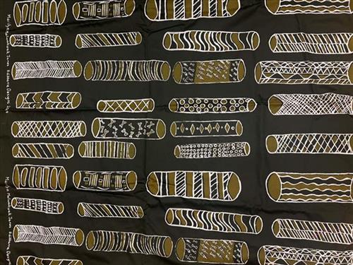 Marilyn’s first screen print design depicts the story of lorrkkon (hollow funeral logs). This the story of her great, great grandfather and grandmother who were bark painters, as well as also sacred lorrkkon painters.