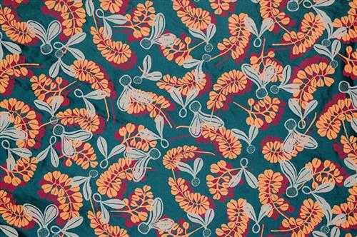 The base fabric is petrol blue and is a three-colour print with tangerine, magenta and light grey coloured details.