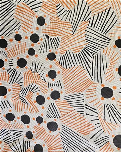 The base fabric is ‘natural’ colour and it is a three-colour print with orange, black and white details.