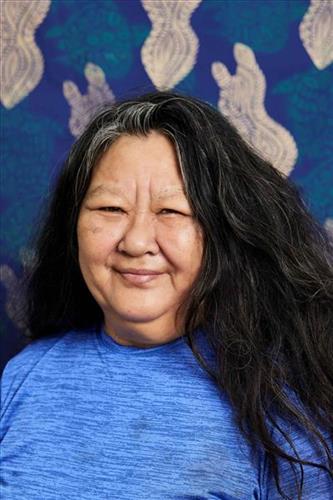 Amanda Rose was born in Rubibi, Broome and has lived here all her life. She began practicing at Nagula Jarndu in 2015 learning hand printing skills, particularly lino block printing on textiles. Amanda Rose grew up spending time with her extended family on Yawuru Country- fishing, hunting, camping out and learning important Yawuru knowledge from the old people. In her art, she is often drawn to the Dreaming story of the Gujarra Jurru- the two headed snake, protector of niyamarri burru (white sand dune country) at Walmanyjun (Cable Beach). Amanda is also a very keen fisherwoman and depicts some of her favourite ocean feeds in her art- yingarliwa (blue bone) and gulban (mullet) best caught during Mangala Season (the Wet Season) when they are nice and fat.