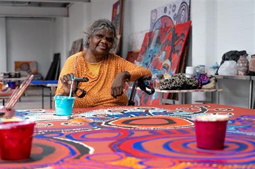 This is a Tjukurpa (Creation Story) about the constellations of Pleiades and Orion. The sisters are the constellation of Pleiades and the other star Orion is said to be the man Nyiru or Nyirunya. Nyiru is forever chasing the sisters known as the Kunkarunkara women as it is said he wants to marry the eldest sister. The seven sisters travel again and again from the sky to the earth to escape Nyiru’s unwanted attention. They turn into their human form to escape Nyiru, but he always finds them and they flee back to the sky. As Nyiru is chasing the sisters he tries to catch them by using magic to turn into the most tempting kampurarpra (bush tomatoes) for the sisters to eat and the most beautiful ili (fig) tree for them to camp under. However, the sisters are too clever for Nyiru and outwit him as they are knowledgeable about his magic. They go hungry and run through the night rather than be caught by Nyiru. Every now and again one of the women fall victim to his ways. It is said that he eventually captures the youngest sister, but with the help of the oldest sister, she escapes back to her sisters who are waiting for her. Eventually the sisters fly back into the sky, reforming the constellation.
