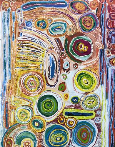 This is a Tjukurpa (Creation Story) about the constellations of Pleiades and Orion. The sisters are the constellation of Pleiades and the other star Orion is said to be the man Nyiru or Nyirunya. Nyiru is forever chasing the sisters known as the Kunkarunkara women as it is said he wants to marry the eldest sister. The seven sisters travel again and again from the sky to the earth to escape Nyiru’s unwanted attention. They turn into their human form to escape Nyiru, but he always finds them and they flee back to the sky. As Nyiru is chasing the sisters he tries to catch them by using magic to turn into the most tempting kampurarpra (bush tomatoes) for the sisters to eat and the most beautiful ili (fig) tree for them to camp under. However, the sisters are too clever for Nyiru and outwit him as they are knowledgeable about his magic. They go hungry and run through the night rather than be caught by Nyiru. Every now and again one of the women fall victim to his ways. It is said that he eventually captures the youngest sister, but with the help of the oldest sister, she escapes back to her sisters who are waiting for her. Eventually the sisters fly back into the sky, reforming the constellation.