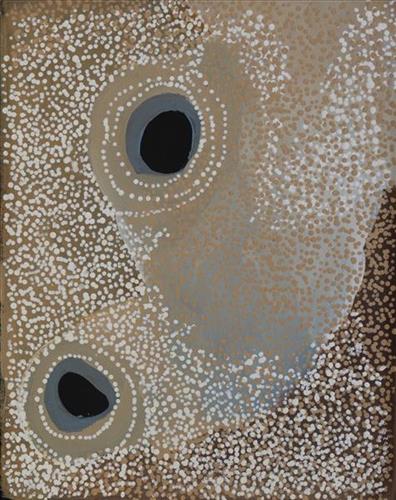 Derrick started painting in school, sketching in charcoal, he then progressed onto painting on canvas. Derrick wanted to paint his story and his family's story; he paints his grandmother's country of Kirriwirri. This place is a significant jila for his family, in the Great Sandy Desert.