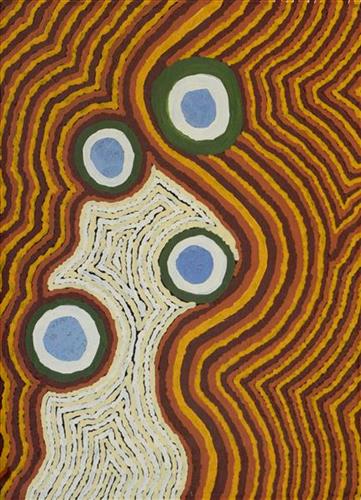 This painting represents the rocky outcrop and all the different areas of claypans, and the dark area represents all the jurnga (sands) in the cool time, warri (translation needed). All the light yellowish colour represents the paru (spinifex).