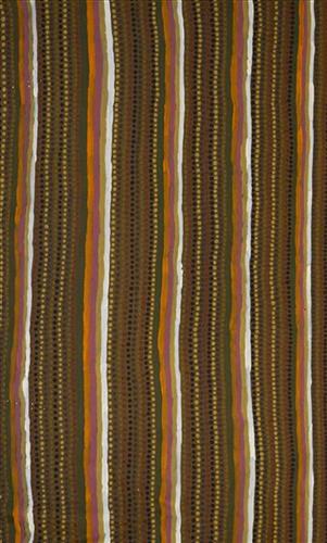 This artwork showcases the artist’s skillful use of colour, texture, and technique, reflecting a deep connection to their environment and culture. Each detail embodies the unique identity of Bidyadanga Artists, where the original five language groups—Nyangumarta, Mangala, Yulparija, Juwaliny, and Karrajarri—come together to create art that speaks to the heart of Country. Over time, the community and Art Centre has grown to include people from other Kimberley tribes, fostering a space where diverse cultural knowledge and practices come together. Situated where the desert meets the sea, artists draw inspiration from their ancestral Country and personal journeys. The artist captures the vibrant beauty of both desert and coastal landscapes, blending earthy reds, deep blues, and intricate patterns distinctive to their cultural heritage. The themes and composition invite viewers into the artist’s world, offering a glimpse of the rich, intertwined histories and the enduring connection to land and spirit that define the Bidyadanga community.