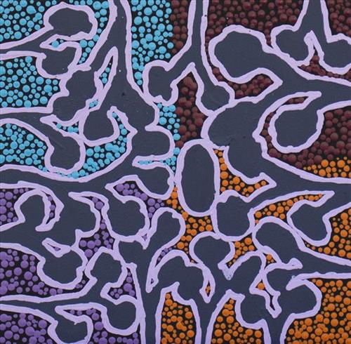 This artwork showcases the artist’s skillful use of colour, texture, and technique, reflecting a deep connection to their environment and culture. Each detail embodies the unique identity of Bidyadanga Artists, where the original five language groups—Nyangumarta, Mangala, Yulparija, Juwaliny, and Karrajarri—come together to create art that speaks to the heart of Country. Over time, the community and Art Centre has grown to include people from other Kimberley tribes, fostering a space where diverse cultural knowledge and practices come together. Situated where the desert meets the sea, artists draw inspiration from their ancestral Country and personal journeys. The artist captures the vibrant beauty of both desert and coastal landscapes, blending earthy reds, deep blues, and intricate patterns distinctive to their cultural heritage. The themes and composition invite viewers into the artist’s world, offering a glimpse of the rich, intertwined histories and the enduring connection to land and spirit that define the Bidyadanga community.