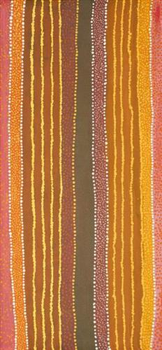 This painting shows the Artists Grandfathers country where they used to walk around in circles searching for bush tucker and water from the waterholes. When our ancestors came out from the Canning Stock route, they used to see big mob of sand dunes and flowers.