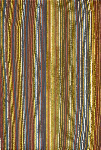 This painting represents the rocky outcrop and all the different areas of claypans, and the dark area represents all the jurnga (sands) in the cool time, warri (translation needed). All the light yellowish colour represents the paru (spinifex).
