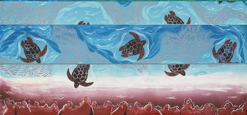 Jaymee-Lee’s paintings are deeply rooted in Bardi culture, storytelling, and the connection between land and sea. Each artwork reflects knowledge passed down by Elders, showing how Bardi people use Country to guide hunting and fishing practices and feature culturally significant totems— ambarn (manta ray), big mullet (baitfish), and stingray—representing survival, hunting, and seasonal knowledge. The colour choices carry meaning: black represents the strength of rocks and sea shadows, while gold reflects sunlight on the water. Pink and earthy tones mirror fish flesh, sand, and tidal pool reflections.